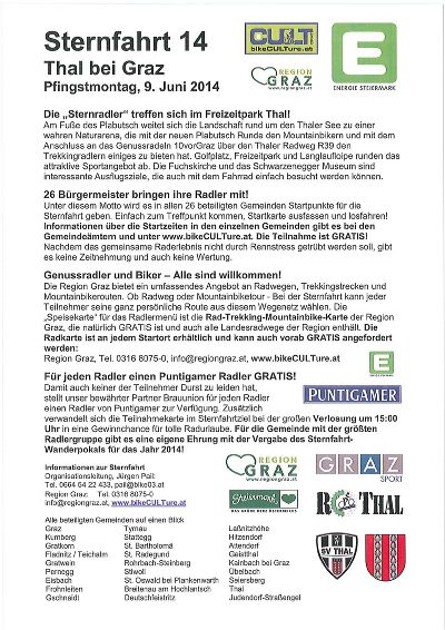 Die Urlaubsregion Graz veranstaltet die Sternfahrt 14 mit dem Ziel in Thal (Freizeitpark Thal), an der sich 26 Gemeinden mit ihren Radfahrern beteiligen. Alle Teilnehmer bekommen am Start eine Teilnehmerkarte (gleichzeitig Los für die Verlosung um 15.00 Uhr bzw. Gutschein für den Puntigamer Radler) und einen Gutschein des Bürgermeisters für eine Konsumation am Sternfahrtziel. Wir fahren vom Gemeindeamt über Rohrbach, St. Oswald, Schirninggraben, Gratwein, Judendorf und Gösting nach Thal. Wer es einfacher haben möchte, kann auch direkt über Oberberg, Steinberg und Thaleben fahren. Um eine ungefähre Teilnehmerzahl für die Gutscheine eruieren zu können, ersuchen wir um eine Anmeldung bei Hans Dokter oder Manfred Stadler (0664/9605651), die sich über eine zahlreiche Teilnahme sehr freuen würden. Im vorigen Jahr erreichten wir in der Teilnehmerwertung den ausgezeichneten 3. Platz nach Stattegg und St. Bartholomä. Auch Nichtradler sind herzlich willkommen.