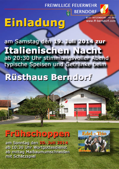 Italienische NachtFreiwillige Feuerwehr BerndorfSa, 19.07.201420:30Ort:Rüsthaus Berndorf Aussendung des Veranstalters: PDF downloaden/drucken » Veranstaltungsort im Ortsplan anzeigen » Link: https://hitzendorf.com/cms/beitrag/10040945/949067/