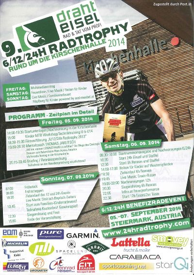 Von 5. bis 7. September 2014 geht rund um die Kirschenhalle bereits zum 9. Mal die "Drahteisel 6/12/24 h-Radtrophy" über die Bühne.