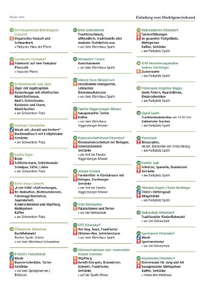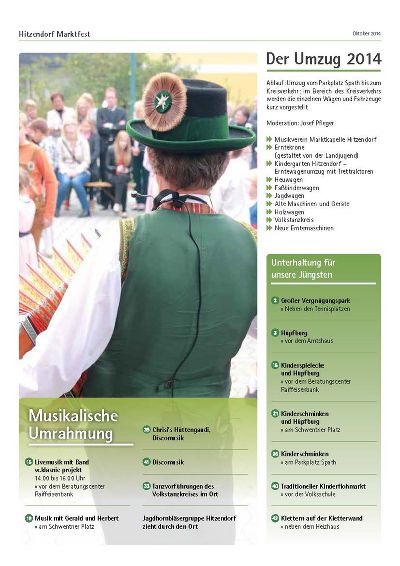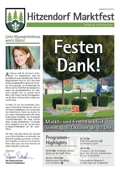 Genießen Sie also den kommenden Sonntag im Hitzendorfer Ortszentrum. Mehr als 40 Vereine, Institutionen und Firmen laden zum Kennenlernen, Kosten und Kaufen ein. Das bunte Rahmenprogramm hält wieder Hubschrauber-Rundflüge, die traditionelle Trachtenmodenschau und heuer erstmals einen Umzug geschmückter Erntewägen bereit. Begonnen wird der Tag mit einem Erntedank-Gottesdienst auf der Spath-Wiese.